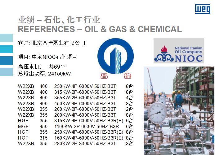 近年來,石化、化工行業(yè)應(yīng)用到WEG高壓電機(jī)越來越多,今天我們和高效電機(jī)人員一起來看看在石化、化工行業(yè)應(yīng)用的一些優(yōu)秀案例: