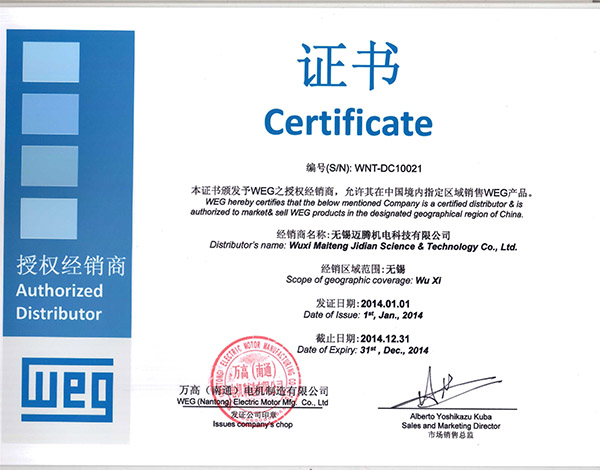 邁騰榮譽(yù)資質(zhì)---2014WEG代理授權(quán)證書