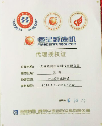 邁騰榮譽(yù)資質(zhì)---2014恒星減速機(jī)授權(quán)代理證書(shū)